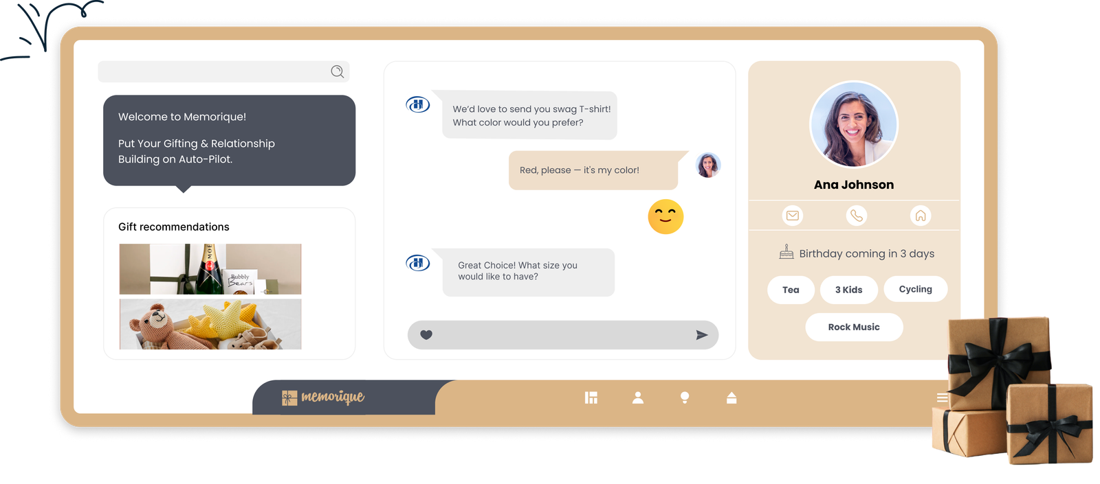 With Memorique, gifting becomes more than just a kind gesture. Strengthen your brand reputation while deepening relationships, all through thoughtful, AI-powered gifting.